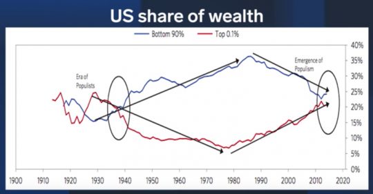 두 시기 모두 중앙은행은 돈을 찍어내서 금융자산을 자산을 매수했습니다. 양적 완화라고도 하죠. 금융자산을 사들였기 때문에 금융자산을 가진 소수에게 부가 몰리는 양극화 현상이 심화했습니다. 결과적으로 포퓰리즘이 득세하게 됐죠. 1930년대와 비슷하게 현 상황을 보면 상위 0.1%의 자산과 하위 90%의 자산이 거의 비슷한 상황입니다.