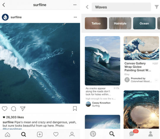 아래의 왼쪽에서 보이는 인스타그램은 사용자가 포스팅하는 사진과 비디오에 분명하게 초점이 맞춰져 있습니다. 반대로 아래 오른쪽에 보이는 핀터레스트는 시각적으로 우선순위를 사용합니다. 검색창을 가장 위에 고정해놓고, 그 밑으로는 멋진 그리드가 놓여 있죠. 핀터레스트에서 검색창을 맨 위에 둔 것은 매우 의도적인 것입니다.