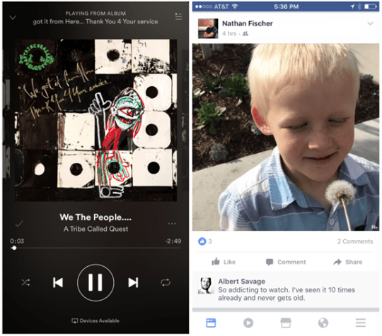 그리고 재생 관련 버튼 중에서도 스포티파이는 앞으로 감기와 뒤로 감기보다, 재생과 일시 정지 버튼이 더 크게 만들어져 있다는 걸 알 수 있습니다. 오른쪽에 보이는 페이스북은 인스타그램과 매우 비슷하게 보이는데 여러분의 친구가 올린 게시물을 맨 앞의 가운데에서 보여줍니다.