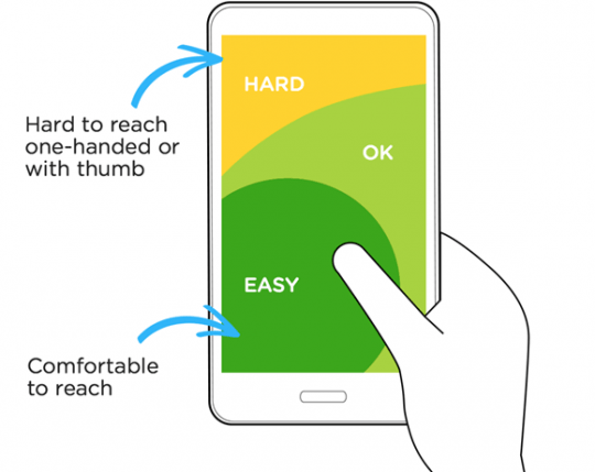 손으로 앱을 조작하게 하는 것은 정말로 중요한 부분입니다. 위의 예시를 통해 우리는 스마트폰에서 손가락으로 만지기 쉬운 부분이 어디인지 알 수 있습니다. 물론 오른손잡이를 예로 들지만 양손 모두 설정하게 해서 디자인을 적용한다면 더욱 좋겠지요. 잘 디자인된 모바일 앱을 보시면, 탐색을 비롯한 핵심 기능들 대부분이 아래쪽 3분의 1 부분에 모인 것을 보실 수 있을 겁니다.