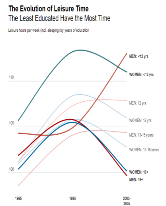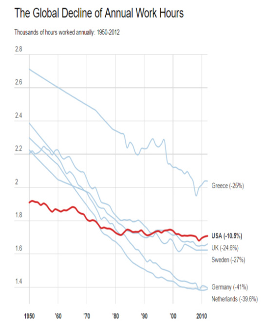 최근 몇 십년 간 유럽과 북미 사람들이 일하는 데 쓰는 시간의 총량은 늘어나지 않았다. 미시간대의 한 연구 결과에 따르면 1997년 부모 세대는 자식들과 시간을 함께하지 못한다고 걱정했지만, 1981년 부모 세대보다 한주에 4~6시간을 더 자식들과 보냈다. 옥스퍼드대 시간활용연구센터의 조나단 거슈니는 지난 50년 간 남성과 여성의 유급, 무급 노동의 비율은 조금 바뀌었지만, 노동의 총량은 꽤 정확할 정도로 똑같다는 사실을 밝혀냈다.주어진 시간에 더 많은 일을 해야 한다는 압박