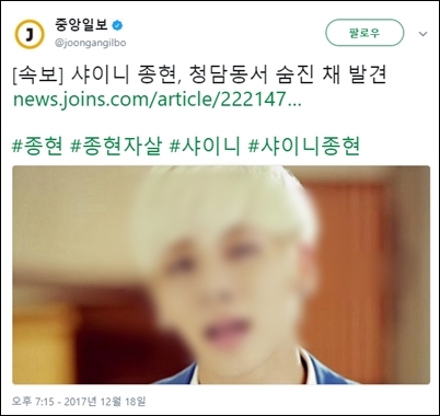 12월 18일 중앙일보 트위터에 「속보, 샤이니 종현, 청담동서 숨진 채 발견」이라는 제목의 기사를 링크한 트윗이 올라왔습니다. 이 트윗에는 ‘#자살’ ‘#종현자살’ 같은 해시태그가 달렸습니다. 네티즌들은 해시태그의 문제점을 지적하며 비판했습니다.