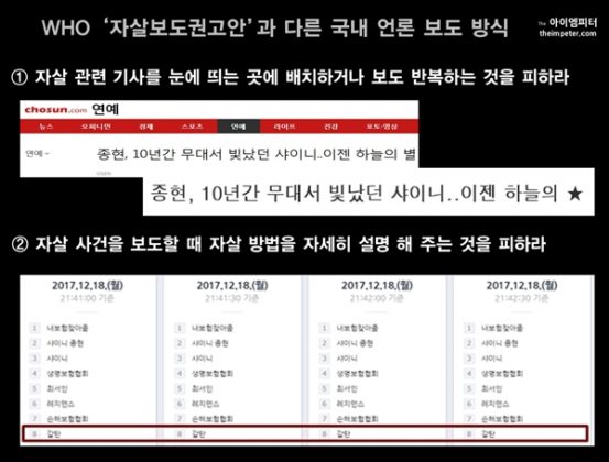 WHO의 자살 보도 권고안을 보면 자살 관련 기사를 눈에 띄는 곳에 배치하거나 반복 보도하는 것을 피하라고 되어 있습니다. 하지만 대한민국 언론은 기회는 이때라는 듯 클릭 장사를 하느라 정신이 없었습니다.특히 연예 관련 기사를 주로 보도하는 매체의 뉴스를 타 언론사가 제목만 바꿔 올리는 일도 빈번하게 벌어졌습니다. 《조선닷컴》은 「종현, 10년간 무대서 빛났던 샤이니..이젠 하늘의 별」이라는 기사를 보도했습니다. 이 기사는 원래 《OSEN》의 「종현, 10년간 무대서 빛났던 샤이니..이젠 하늘의 ★」 기사를 그대로 보도한 것입니다.