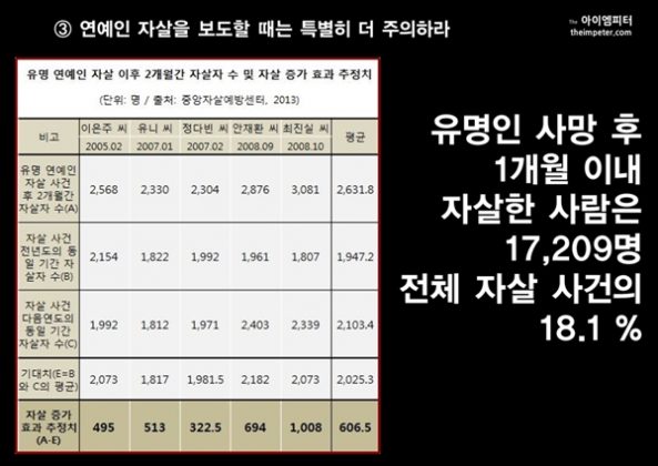 WHO는 연예인 자살을 보도할 때는 특별히 더 주의하라고 합니다. 그 이유는 연예인 또는 유명인의 자살 이후 자살이 급증하기 때문입니다. 성균관대 의대 삼성서울병원 전홍진 교수팀이 2005~2011년 사이 국내에서 자살로 사망한 9만 4,845명을 대상으로 조사한 결과 국내 자살 사건의 18%는 유명인의 자살 사건 후 1개월 이내에 집중된 것으로 나타났습니다.7년의 연구 기간 동안 자살 사건으로 TV와 신문 매체에 1주일 이상 보도된 유명인은 총 13명이었습니다. 이들의 사망 후 1개월 이내에 자살한 사람은 1만 7,209명으로 전체 자살 사건의 18.1%를 차지했습니다. 유명인의 자살 전 1개월간 하루 평균 자살자가 36.2명, 유명인 한 명이 자살한 후 1개월간 하루 평균 자살자는 45.5명입니다. 무려 9.3명이나 늘어났습니다.전홍진 교수는 “유명인의 자살이 일반인의 자살에 큰 영향을 미칠 수 있는 만큼 사회적으로 큰 영향을 주는 유명인이 사망한 경우에는 언론에서 감정적이나 자극적인 보도를 자제해야 한다”고 지적했습니다.