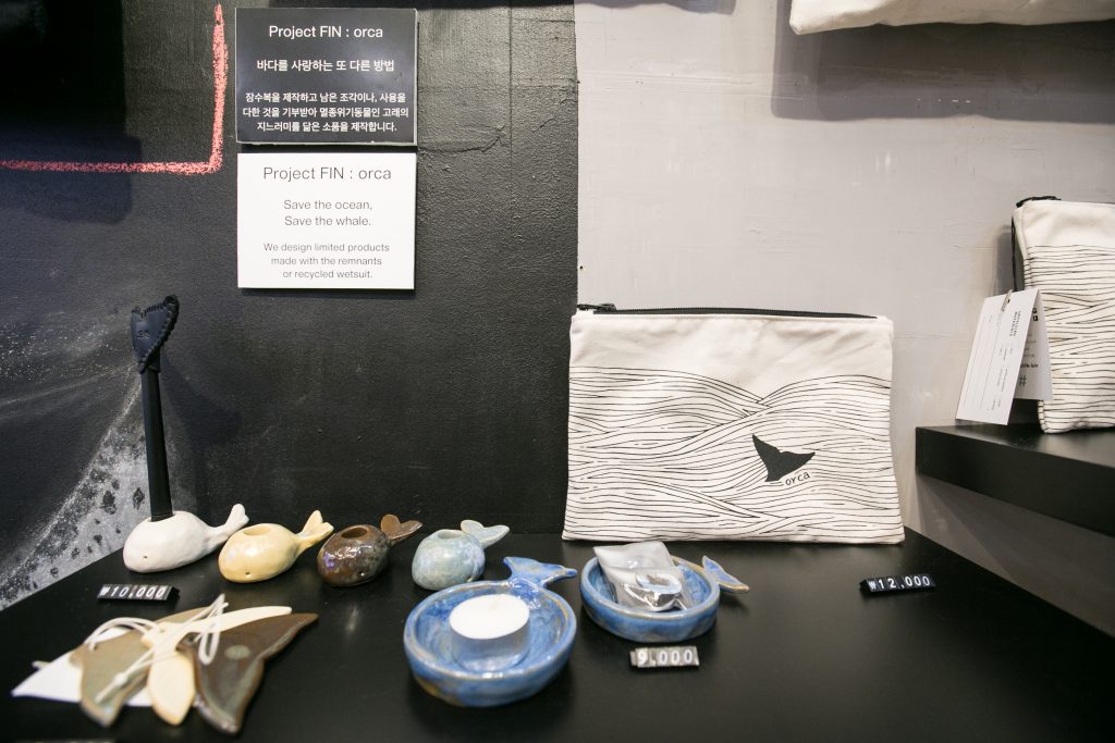 최근에는 해양 동물을 살리는 캠페인에 에코인블랭크는 가방, 콘삭스는 양말, 공기는 선물용품을 만들어 이슈를 환기하는 작업을 했습니다.
