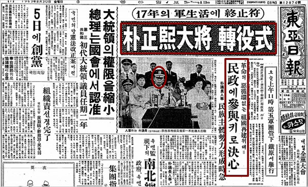 박정희는 1963년 8월, 과업이 성취되면 정권을 이양하고 군에 복귀한다는 ‘혁명 공약’과 달리 강원도 철원의 제5군단 비행장에서 전역식을 치르고 예비역 육군 대장으로 예편했다. 그는 ‘혁명과업의 완성을 위해 민정 참여를 결심했다’며 ‘다시는 이 나라에 본인과 같은 불운한 군인이 없도록 하자’는 유명한 전역사를 남겼다. 그러나 그의 불운은 이후 전개된 18년간의 독재를 통해 한국의 민주주의와 자유와 인권에 큰 상처를 남겼다.