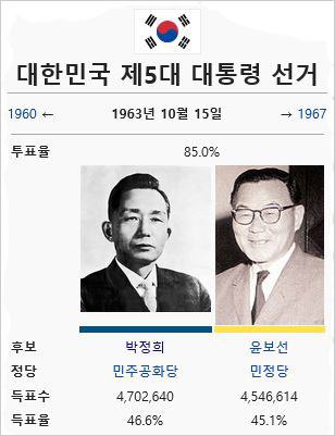 전역과 동시에 민정에 참여한다고 발표한 박정희는 곧바로 사전 창당된 민주공화당에 입당해 제5대 대통령 선거에 출마했다. 선거에서 박정희는 46.6%를 획득해 45.1%를 획득한 윤보선에게 1.5% 차로 간신히 승리했다. 두 후보의 표차는 15만 6026표, 한국의 대통령 선거 사상 가장 근소한 표 차였다.