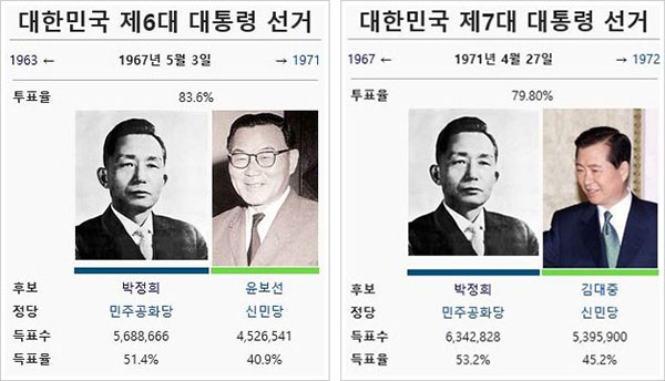 1967년 제6대 대선에서도 승리한 박정희는 1969년, 국민 투표를 통해 제6차 개헌안(3선개헌)을 통과시켜 3선의 기반을 만들었다. 1971년, 박정희는 제7대 대통령 선거에서 신민당의 김대중 후보를 누르고 3선에 성공했다.