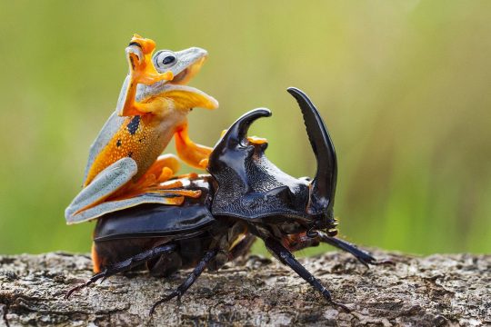 2015년에 촬영된 사진 한 장이 인터넷에서 많은 사람의 극찬을 받았습니다. 특히 사진을 잘 모르는 일반인들은 정말 신기한 장면을 포착했다며 감탄할 수밖에 없는 사진이었습니다. 작은 개구리가 딱정벌레 등에 탄 채 마치 로데오 게임을 하는 듯한 자세를 취했습니다.