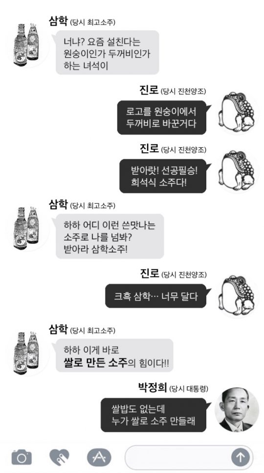 동물만 바꾼 것이 아니다. 1965년 진로는 소주 생산방식을 바꿨다. ‘희석식 소주’를 선보인 것이다. 이는 마른오징어에서 물 짜듯이 값싼 재료에서 기계 증류탑을 이용해 알콜을 97~98%까지 뽑는 방식이다. 이 강한 알콜(주정)을 물에 타면서 희석식이라는 이름이 붙었다. 희석식 소주는 기존 소주에 비해 원가가 싸고 만들기가 쉬웠다. 문제는 알콜냄새와 쓴맛이 강했다. 할아버지는 말했을 거다. “이건 소주가 아니야!”