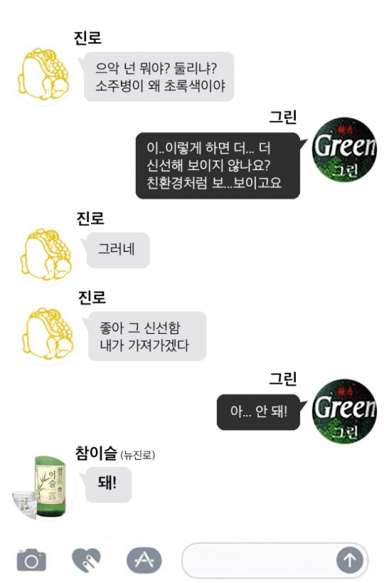 그 주인공은 1994년 두산경월(이하 두산)에서 나온 ‘그린’소주다. 여러 소주들 사이에서 튀어보는 게 첫 번째 목적. 그리고 초록색 병으로 친환경 이미지까지 노리는 게 다음 목적이다. 색깔 하나 바꾼 게 뭐가 대수냐고? 효과는 놀라웠다. 새파랗게 젊은 그린은 한때 시장점유율 20%까지 차지하며 진로를 추격했다.