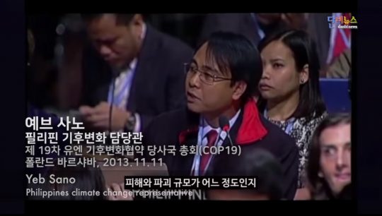 2013년 11월 태풍 ‘하이옌’이 8,000명 넘는 사상자를 낸 직후 폴란드 바르샤바에서 열린 제19차 기후변화협약 당사국총회(COP19)에서는 예브 사노(44) 그린피스 동남아시아 사무총장이 눈물을 흘리며 국제사회의 각성을 호소했다. 필리핀 정부 대표 자격으로 참석한 그는 단식을 선언하며 “기후변화를 부정하는 사람들은 지금 당장 필리핀을 방문하라”고 절규했다.