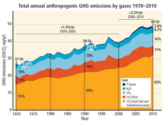 이 보고서에 따르면 2010년 기준 전체 온실가스 중 이산화탄소가 차지하는 비율은 76%이며 이중 화석연료 연소 및 산업 과정에서 발생하는 비율이 65%다. 18세기 산업혁명 이전 280ppm이던 대기 중 이산화탄소 농도는 2011년 391ppm으로 증가했고, 2017년 현재 400ppm을 넘어섰다. 미국 국립해양대기청(NOAA)에 따르면 같은 기간 지구 평균기온은 1℃ 상승했다. IPCC는 인류가 지금부터 온실가스를 적극적으로 감축하더라도 이번 세기 중반까지 최소 0.4℃ 이상의 온도 상승은 불가피할 것으로 본다.
