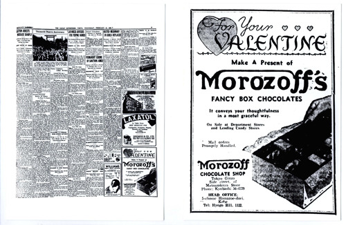 이러한 발렌타인데이의 풍습은 20세기 초반에 일본에 들어와 있던 선교사들을 통해서 일본 내에서도 서양문물에 밝은 지식인들 사이에서 상당히 붐을 이루게 됩니다. 이러한 붐에 맞춰서 1936년 고베의 '고베 모로조프 제과'라는 곳에서 "고마운 분들에게 감사의 마음을 담아서 발렌타인 초콜릿을 전합시다"라는 이벤트를 발렌타인데이에 맞춰서 시행합니다.