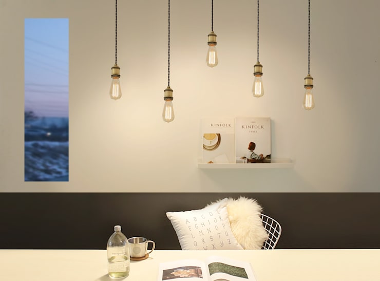 갓이 없는 조명은 왠지 앙꼬 없는 찐빵처럼 허전할 것 같은 느낌이지만, 그대로 드러난 전구 모양은 의외로 세련되고 감각적인 공간 분위기를 자아낸다. 에디슨 전구를 구매하고자 한다면, 전구는 LED 타입으로 선택하고 소켓과 함께 천장에 연결할 수 있는 줄도 같이 구매하자. 또한 사진처럼 전구의 높낮이에 차이를 주면 리드미컬한 공간을 연출할 수 있다.