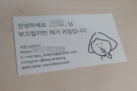 귀찮: 퇴사하는 날 프리랜서 할 건데 명함 정도는 만들어야지 싶었어요. 근데 킨코스 갔더니 생각보다 너무 비싼 거예요. 그래서 그냥 프린터기에서 한 장 뽑아서 오렸어요. 이렇게 얇고 허접해도 안 드리는 것보다는 낫겠지 싶어서. 다 쓰고 나서는 스노우지로 바꿨어요. 내 일에 대한 마음가짐의 무게가 A4용지보다는 무거워졌다 싶어서요. 그런데 이것도 제일 저렴한 거예요. 좀 더 잘하면 두꺼워질 것도 같은데, 지금은 딱 이 정도인 것 같아요.