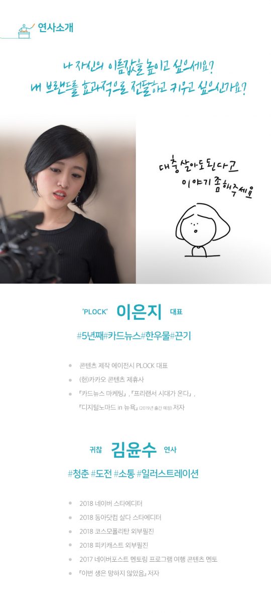 그동안의 퍼스널 브랜딩 강의가 주로 피부 톤과 이미지, 보이스 트레이닝 등 외적인 부분에만 치중이 되어있었다면 픗픗에서 ‘이은지’ 님, ‘귀찮’ 님과 준비한 이 강의는 디지털시대에서 직업을 가진 사람으로서 직장이 있든 없든 어떻게 나 자신을 살아남게 할지 경험을 공유해보려 합니다.