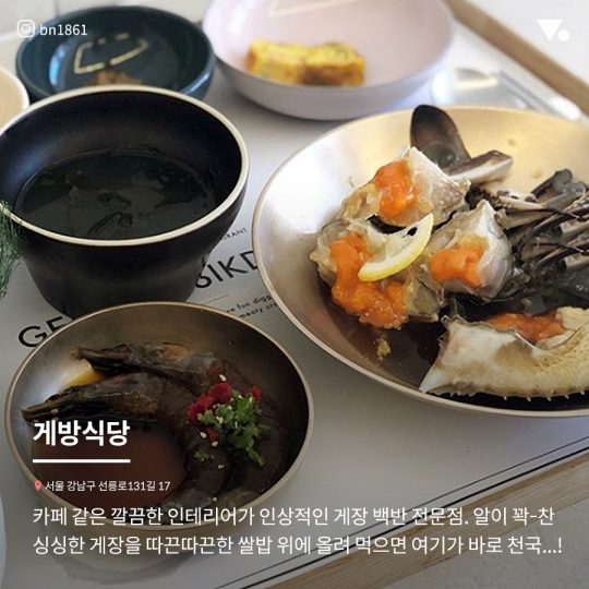 이곳의 주메뉴는 바로 게장 백반이랍니다. 짭쪼름한 간장 게장 백반과 감칠맛이 느껴지는 양념게장 백반 모두 국내산 암꽃게를 사용해 싱싱함은 기본. 따끈따끈한 쌀밥 위에 싱싱한 게장을 올려서 한 입, 게딱지에 잘 비벼서 한 입 먹으면 여기가 바로 천국….