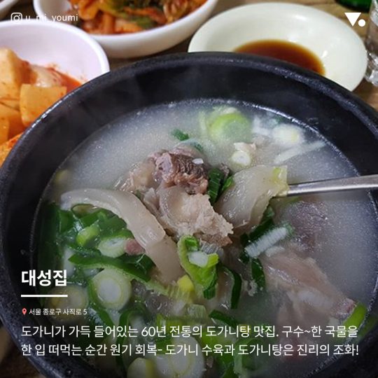 도가니탕 뿐만 아니라, 도가니와 스지를 잘 삶아 내어주는 도가니 수육도 별미라고 해요. 도가니탕에 밥 한 공기를 넣고 잘 말아서, 밑반찬으로 나오는 마늘 장아찌를 올려 먹으면 말 그대로 꿀맛. 겨우내 떨어진 체력을 이곳에서 찾아보시는 거 어떨까요?