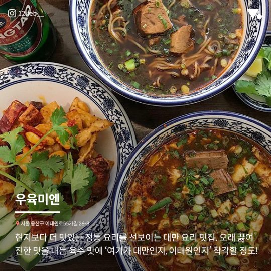특히 이곳의 대표 메뉴인 우육면은 도가니, 채소, 향신료 등을 넣고 정성을 다해 오.래 끓여 진하고 깊은 맛을 느낄 수 있다고 해요. 육수 한 숟가락에 여기가 대만인지, 이태원인지 착각이 들 정도라고 하네요 :D