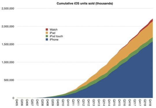 아이폰이 출시되기 1년 전인 2006년, 애플의 소비자들은 아이튠즈, 소프트웨어 및 서비스에 33억 달러를 지출했다. 2018년이 되자, 연간 805억 달러로 증가했다. 올해로 1,000억 달러에 이를 가능성이 아주 높다. 이 새로운 사업 부문은 이제 단순하게 '서비스'라고 불리며, 주로 제삼자 앱과 제삼자 콘텐츠 판매 및 라이선싱으로 구성되어 있다.