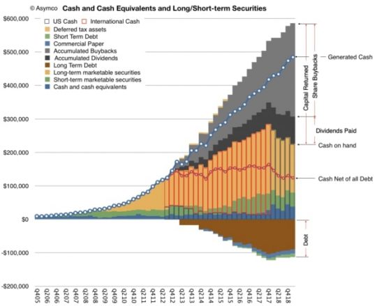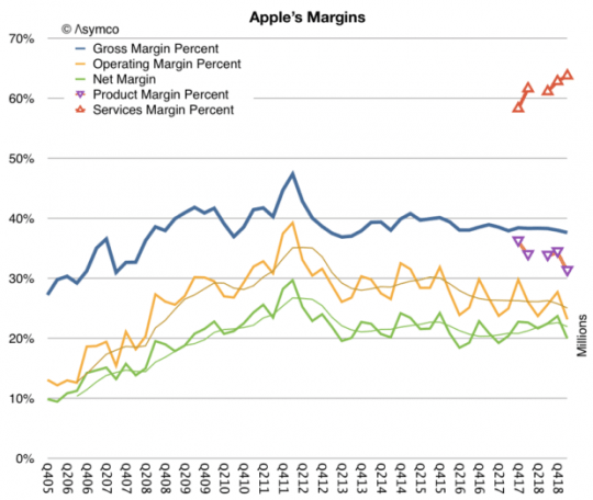 일각에서는 매출과 영업에서 차지하는 비중을 볼 때 애플은 아직 하드웨어 기업이므로 낮은 이윤, 혼란 가능성, 매출 감소 및 순환성의 위험이 있다고 주장한다. 하지만 그렇지 않다. 애플의 사업은 이윤이 높고(서비스 부문의 총 마진은 64%, 제품은 34%), 12년 동안 꾸준함을 유지해 온 동시에, 수백 가지 저가격의 모방 제품이 나타나기도 했으며, 고객의 충성도로 90% 이상의 재구매율을 유지한다. 순환성은 경쟁이 아니라 계절성과 제품 수명에 의해 움직인다.