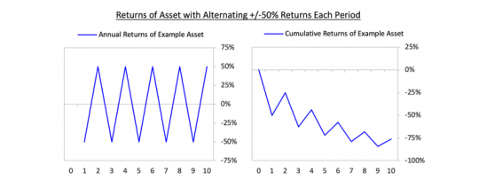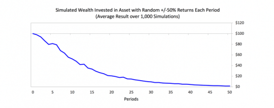 또 다른 투자의 큰 요소 중 하나는 거대한 손실은 거대한 수익으로 보상받지 못한다는 것입니다. 그러므로, 모든 수단과 방법을 가리지 않고 거대한 손실은 피해야 한다는 것입니다. 계속 수익과 손실이 50%씩 오간다면, 저는 장기적으로 큰돈을 잃을 것입니다. 50% 손해를 봤을 때 원금을 되찾으려면 100%의 수익이 나와야 하니까요. 그림으로 그려보면 아래와 같습니다.
