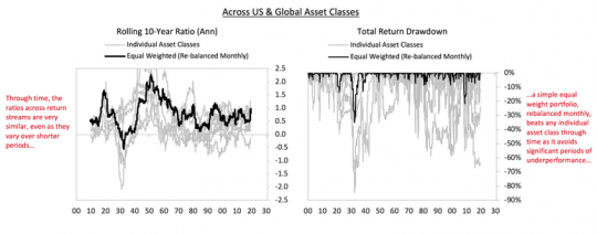 위에서 언급한 2개의 원칙과 정치인(policymaker)들이 시장의 극단적인 가격에 개입함에 따라 가격은 반대 폭으로 크게 움직이고 패러다임의 변화가 발생합니다. 그렇기에 하나의 투자에 비해서 다각화가 잘 되고 주기적으로 리밸런싱 되는 포트폴리오가 더 높은 리스크 기대 수익을 얻을 것입니다.