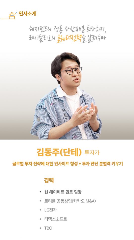 이 강의는 김동주 님의 시각으로 투자라는 게 어떻게 이뤄지는지, 또 세계 1위의 헤지펀드가 어떻게 하고 있는지 정리하고 적용한 내용을 공유합니다. 강의는 강의지만, 강의 끝나고 돌아간 후 여러분들이 진짜 장기 투자를 할 수 있어야 합니다. 일반인들의 재테크 수단이었던 주식투자로 시작을 해서 인덱스 펀드를 거쳐서 가다 가다 보면 올 웨더까지 갈 거예요.