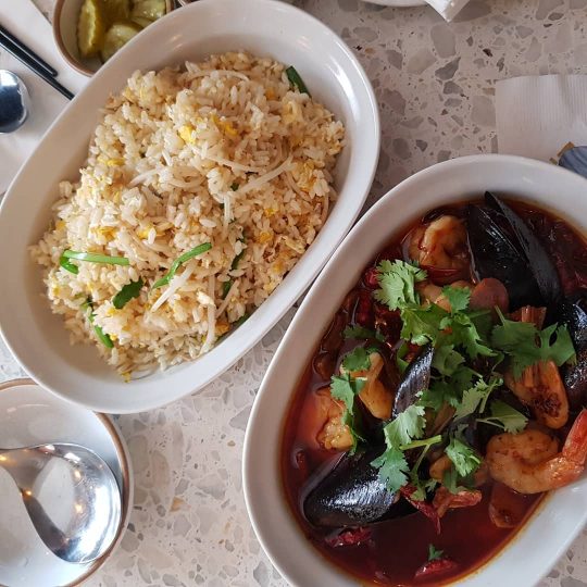 살이 통통하게 올라 씹는 재미가 있는 새우부터 당면, 버섯, 홍합 등의 재료를 넣어 푸짐함을 더했다. 달걀과 숙주를 넣고 고슬고슬하게 볶아낸 볶음밥이 함께 제공되는데, 밥 위로 마라 소스를 올려 비벼 먹는 것이 더욱 맛있게 먹을 수 있는 팁이다.