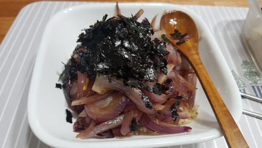 아내와 아이들은 안 먹는다고 해서 혼자서 처음으로 양파 밥을 해 먹어 봤다. 원래 레시피에는 양파 밥에 계란 후라이를 반숙해서 올려 먹곤 하던데, 계란은 생략하고 김 가루를 뿌려줬다. 꿀맛!
