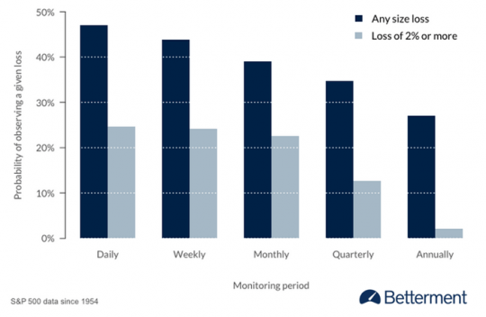 강박적으로 투자 수익률을 확인하는 것도 마찬가지다. 자녀를 강박적으로 과잉보호하는 부모와 마찬가지로, 무엇을 기대하고 수익률을 강박적으로 확인하려 드는 것일까? 하지만 그 결과는 유감스럽다. 더 자주 포트폴리오를 들여다보고 수익률을 확인할수록, 손실을 목격할 가능성이 더 커진다. 이는 근시안적인 결정을 내리게 하고, 투자 수익률에 해를 끼칠 수 있다.
