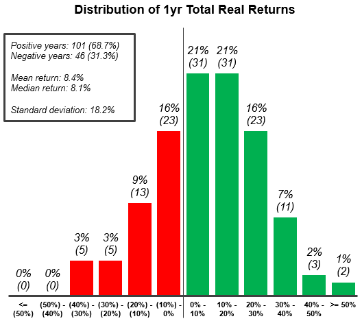 일간 주가 변동은 무작위 한 사건 및 비이성적 감정의 영향을 받는다. 겁에 질린 원숭이 무리에서 진화한 인간의 뇌는 이 중요한 사실을 처리할 수 없다. 장기적인 신념을 버리고 단기적인 변동성에 집중하는 건 쓸데없는 헛수고에 불과하다. 동전 던지기로 자신의 재무 계획을 세우는 건 결코 좋은 생각이 아니다. 투자에서는 일반적으로 시간이 투자자의 편이다. 연간을 기준으로 할 때, 평균적으로 주가가 상승할 확률이 더 크다.