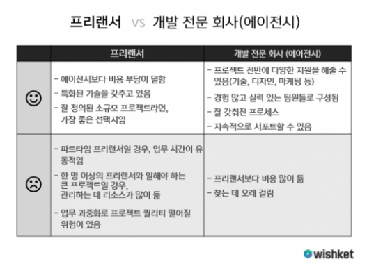 아웃소싱 의뢰할 작업자를 구할 때 개발 업체에 맡길지, 개인 프리랜서에게 맡길지 선택할 수 있습니다. 어떤 선택지가 더 좋을지는 여러분이 의뢰하려는 프로젝트 규모에 따라 달라지지요.