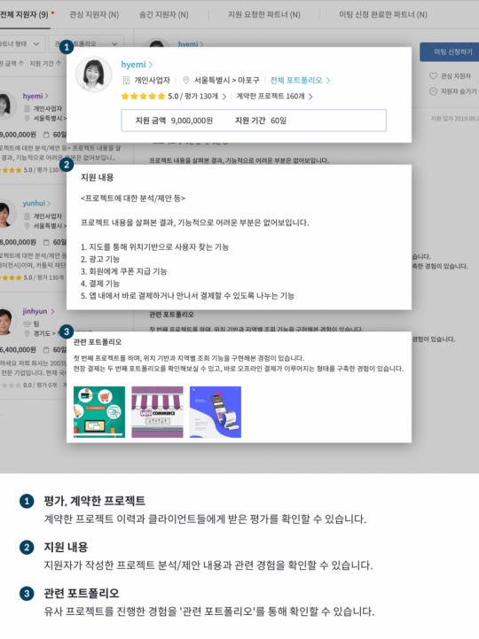 어디서 적합한 개발 업체를 찾아야 할지 막막하신가요? 위시켓에 프로젝트를 등록하고 여러 업체를 한 번에 비교해보세요. 위시켓에 의뢰하려는 업무를 등록하면, 해당 작업이 가능한 작업자들이 지원합니다. 개발회사, 프리랜서, 팀 등 다양한 형태의 IT 전문 인력 7만여 명이 위시켓에 모여 있습니다. 여러분은 지원자들의 프로젝트 분석/제안 내용, 제안 금액/기간, 관련 포트폴리오, 평가 등을 한눈에 비교해보고 마음에 드는 작업자를 선정할 수 있습니다.