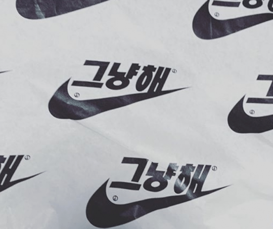 파라노이즈 신발의 포장지를 살펴보면 특이하게 한글로 적힌 '그냥 해'라는 글자와 나이키의 로고가 결합한 패턴이 프린팅되어 있다. '그냥 해'는 영어로 'just do it'이며 이는 나이키의 유명한 브랜드 카피이기도 하다.