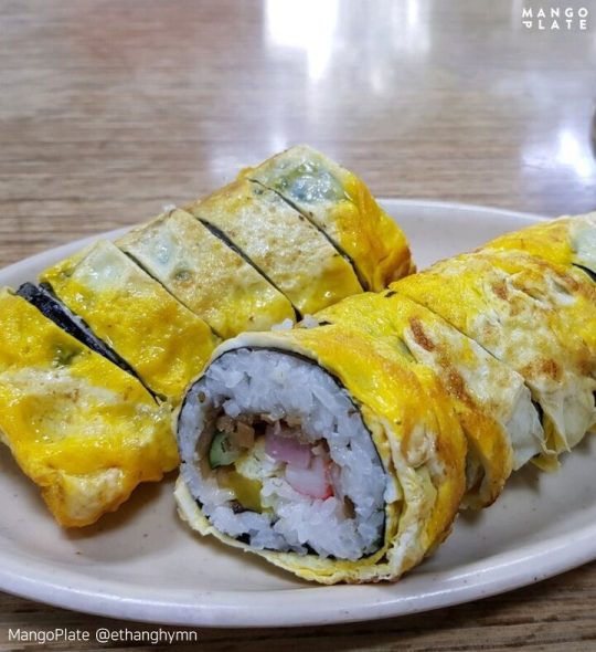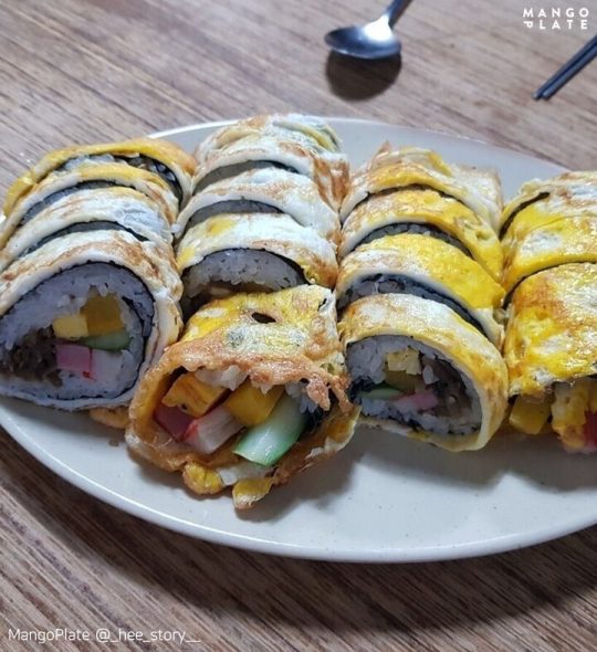 계란말이 김밥 전문 분식집. 이곳에 오면 묻지도 따지지도 말고 계란말이 김밥은 주문 필수인데요. 김밥에 계란지단을 입힌 투박한 모양에 씹을수록 계란의 고소한 맛이 도드라져요. 특별한 것 없는 속 재료이지만 쫄면이나 쫄우동과 함께 곁들이면 묵직한 존재감을 나타낸답니다.