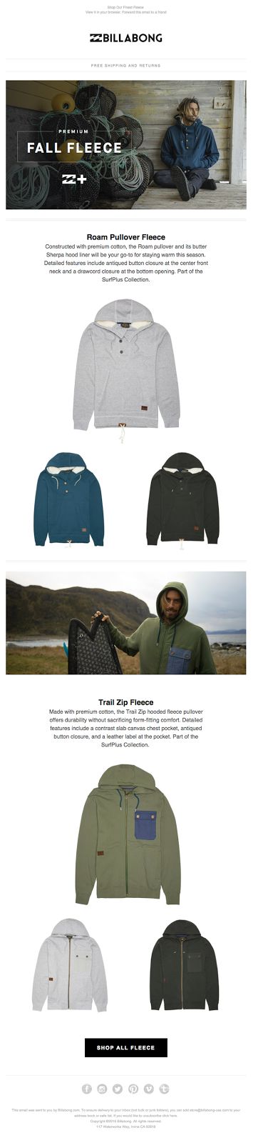 아래 예시에서 빌라봉(Billabong)은 양털 플리스 프로모션을 진행 중입니다. 리스트에 있는 모든 사람이 프로모션 메일을 받더라도 성별별로 분류되어 수신자와 더욱 관련성 높도록 진행합니다. 여기에서 사진, 추천 제품, 그리고 문구 등은 모두 남성과 여성을 모두 타깃으로 작성된 것이 아니라 오직 남성을 타깃으로 콘텐츠를 개인화했습니다.