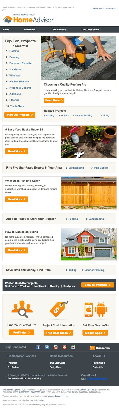 주택 환경 개선 전문가와 연결해주는 홈어드바이저(HomeAdvisor)의 뉴스레터는 세그먼트 머신입니다. 뉴스레터를 클릭하면 구독자가 어떤 주제의 주택 개선 프로젝트에 관심이 있는지 알 수 있습니다. 이들을 팔로업 이메일 캠페인을 통해 쉽게 분류할 수 있어 앱을 사용해 서비스를 이용하도록 유도할 수 있습니다.