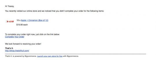 한 번의 이메일로 이 모든 작업을 수행할 수도 있으나, 첫 번째 이메일 이후에 3~5일 후에 특별한 구매 혜택이 담긴 팔로업 이메일을 보낼 수도 있습니다. 10% 할인 쿠폰 등 여기서 나가는 구매 혜택들은 구매를 완료하는 데 강력한 트리거가 될 수 있습니다. 아래는 댓스 잇 프룻(That’s It Fruit)의 버려진 장바구니 팔로업 이메일 예시입니다.