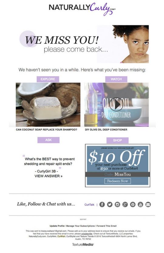 4. 고객 재방문 유도한 동안 고객을 보지 못했나요? 윈백(Win back) 이메일로 그들과의 인터랙션을 시작하세요. 이런 유형의 이메일은 고객과의 관계를 구축하고 브랜드의 개성을 보여주고 비즈니스 가치를 알리는 좋은 방법입니다. 또한 할인 코드를 포함시켜 사이트에 다시 돌아올 수 있도록 영향을 미칠 수 있습니다.
