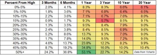 과거 주식시장 데이터는 지금의 낮은 수익률이 미래의 높은 수익률로 이어진다고 말하고 있다. 최근 포스트 「주식시장이 하락할수록, 기대 수익률은 더 높아진다」에 나온 아래 표를 보면, 주식시장이 고점 대비 하락한 수준별로 향후 평균 수익률은 어떻게 되는지 보여준다.