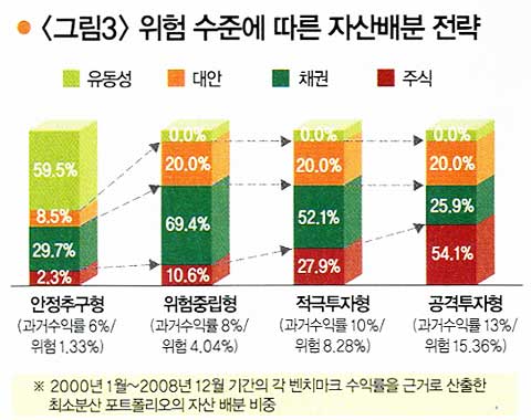 금융시장에서 중요한 개념이 바로 ‘리스크’다. 계란을 한 바구니에 담지 말라는 속담이 여기서 나온다. 한 군데서 손해가 나도 다른 곳에서 이익이 나면 큰 손실을 면할 수 있다. 앞서 언급한 6~12%의 목표 수익률을 달성하기 위해서는 자산 배분이 필수적이다. 개별 주식 안에서도 배분해야 하고, 섹터별, 국가별, 금융상품별로도 배분해 놓는 것이 좋다. 자산 배분은 거의 습관에 가깝기 때문에 금융시장에 참여하기 시작할 때부터 리스크에 대한 대비를 해야 한다.
