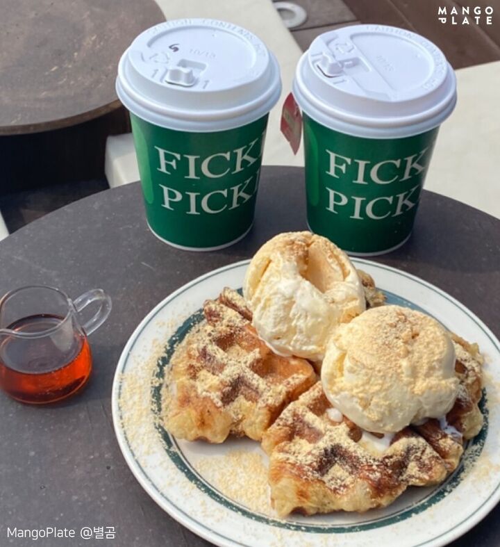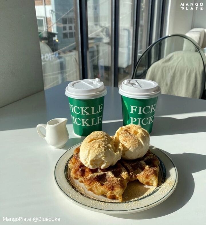 피클 피클의 목적은 바로 이 크로플! 크로플은 두 가지 옵션이 있는데요. 하나는 아이스크림과 먹을 수 있고, 또 다른 하나는 애플 잼과 크림치즈와 함께 먹을 수 있는 옵션이 있어요. 어떤 걸 올려 먹어도 맛있는 게 크로플 아니겠어요? 남산 전경과 함께 힙한 분위기에서 크로플을 즐기고 싶다면, 피클피클을 추천해요.