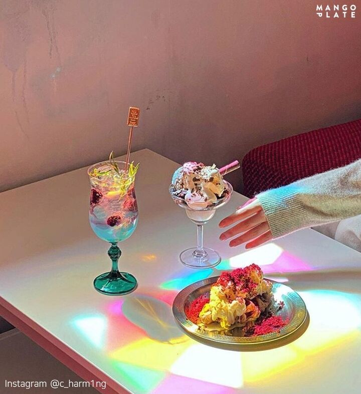 을지로에서 크로플을 만나볼 수 있는 신상 카페 '베로나'를 소개해요. 와! 여기 분위기 뭐죠? 이곳은 스테인드글라스를 통해 빛이 들어와 몽환적인 분위기를 느끼며 크로플을 맛볼 수 있어요.