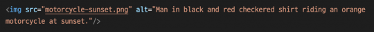 이미지 태그 내에 추가된 품질 대체 태그는 이미지의 내용뿐 아니라 페이지에서의 목적을 서술하는 간단한 설명이다. HTML 코드에서 사용하면 전체 이미지 태그는 다음과 같다.