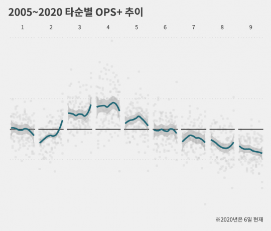 제가 블로그에 글을 쓰기 시작했던 2005년 2번 타자는 조정 OPS(OPS+) 91을 기록했습니다. 리그 평균(100)보다 9% 못 치는 타자가 2번 타순에 들어갔던 것. 이제 2번 타자 OPS+는 107입니다. 이 기간 이렇게 OPS+가 크게 올라간 타순은 2번 자리밖에 없습니다.
