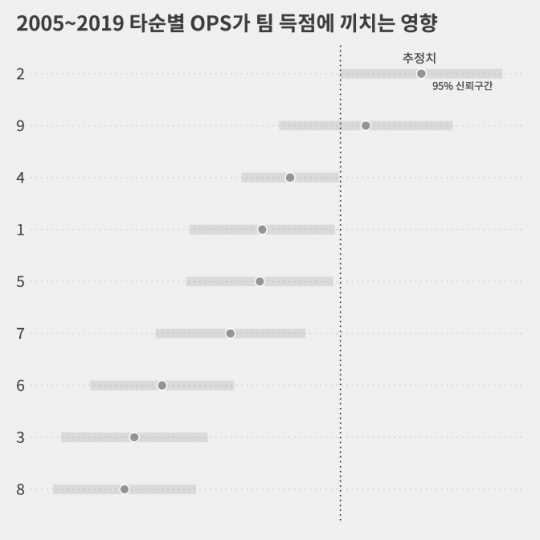 9번 타자가 2번 타자 다음으로 영향력이 큰 건 아마도 '9번 타자조차 강한 팀' 현상이 영향을 끼쳤을 겁니다. 맨 마지막 타순은 원래 '공격수'가 아니라 '수비수'가 들어서는 자리니까요.