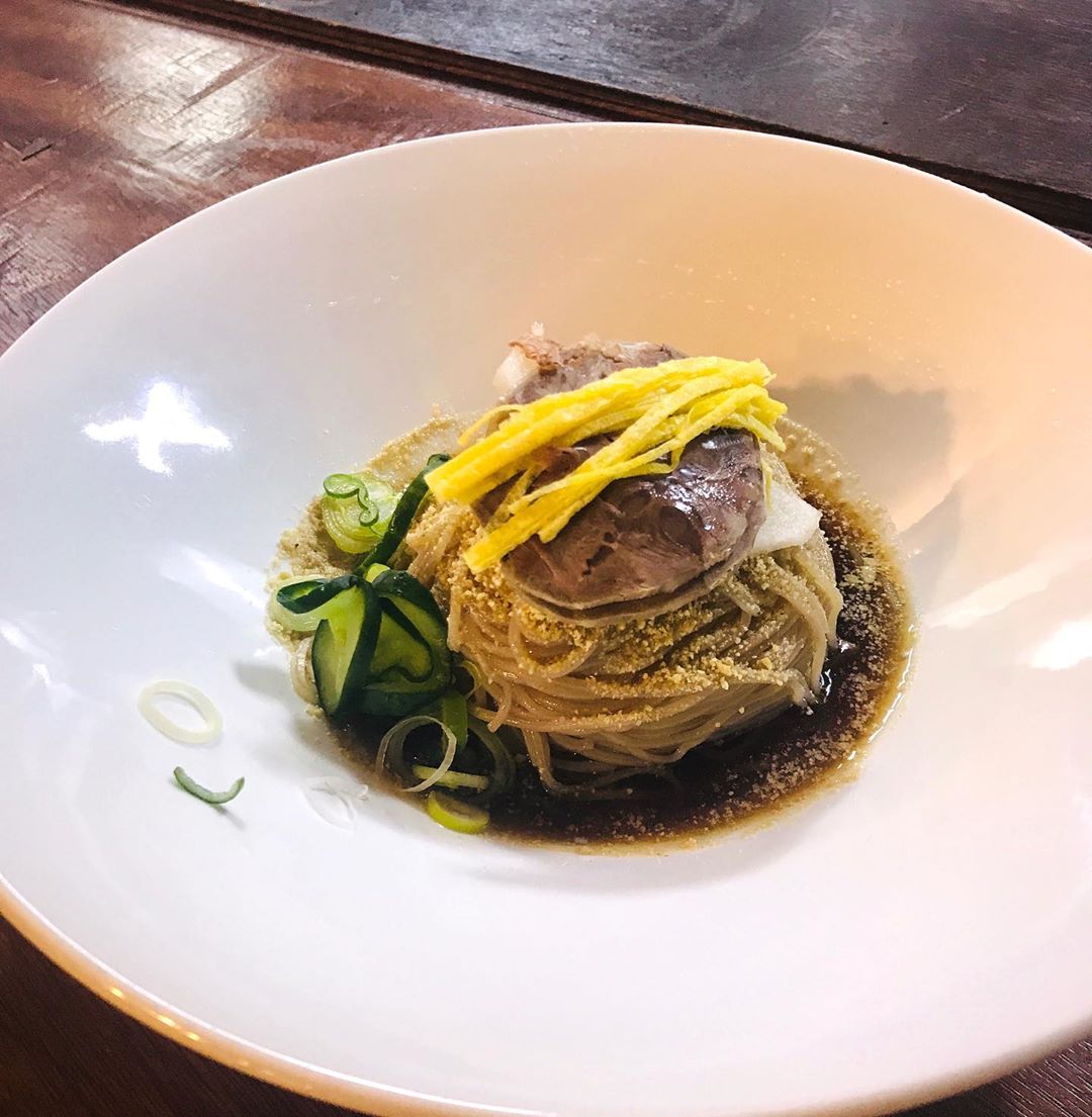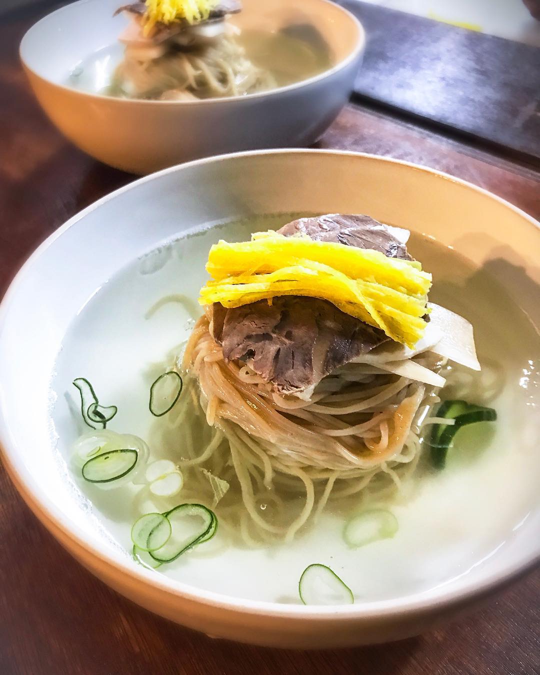 대표 메뉴는 소의 양지, 사태, 설깃살과 돼지 삼겹 부위를 푹 삶아 낸 육수로 선보이는 ‘당인 냉면’. 촘촘한 면포에 육수의 불순물을 제거하는 과정을 3번이나 거쳐 잡내 없이 깔끔한 맛을 경험할 수 있다. 부드러우면서도 적당한 탄력이 살아있는 면발과 간간한 국물이 부담스럽지 않게 다가와 평양냉면 초심자도 쉽게 도전할 수 있다.