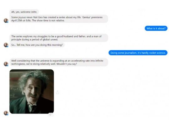 내셔널 지오그래픽은 자사 페이스북 페이지에 메신저봇을 설치해 사용자들이 알버트 아인슈타인, 파블로 피카소 등과 같은 세계적인 위인들과 대화를 나눌 수 있도록 했습니다. 내셔널 지오그래픽의 TV 쇼인 ‘Genius’는 일련의 사건과 역사, 그리고 유명인들의 데이터를 활용해 메신저봇을 만들었습니다. 이 챗봇들은 사용자들의 대화를 따라가고, 그들에게 해당 TV 쇼를 알려주고, 관련 주제에 관해 토론을 벌입니다.